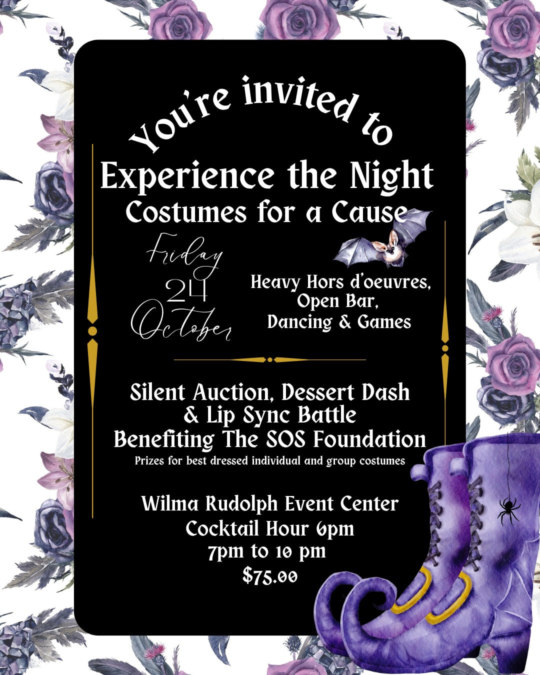 Join us on October 24th, 2025, for a fan-favorite experience at the Wilma Rudolph Event Center! Heavy Hors d'oeuvres • Open Bar • Dancing and Games • Lip Sync Battle • Silent Auction • Dessert Dash • Prizes for Individual and Group Costumes Benefitting the Spreading Our Support Foundation. Tickets and Sponsorships are now available for purchase. Get ready to put on your costumes and party with a purpose! (Costumes are not required, but are encouraged.)